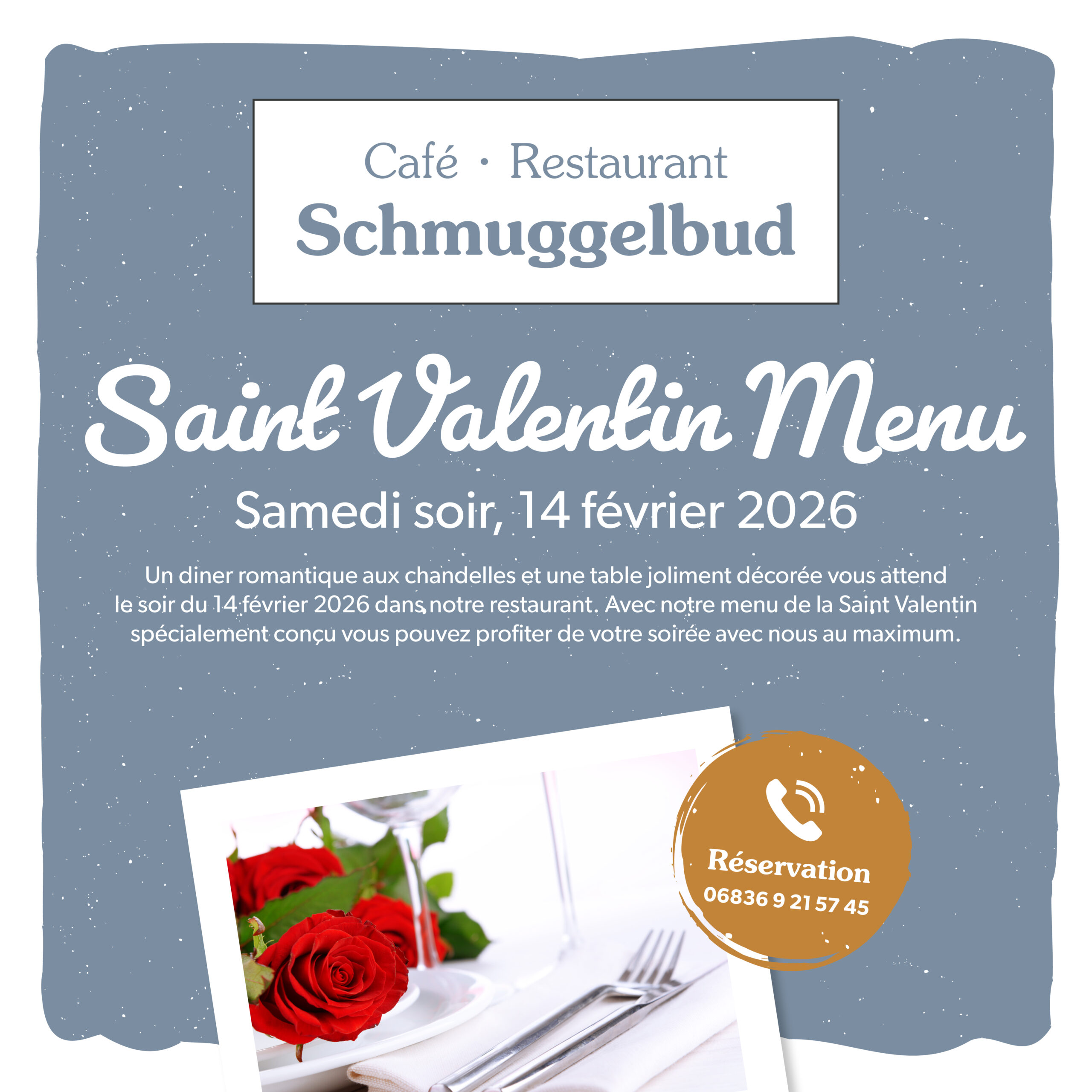 Le 14 février, c’est la Saint-Valentin ! Réservez vite votre table et savourez quelques heures de sérénité ainsi que notre menu spécial Saint-Valentin à la Schmuggelbud !